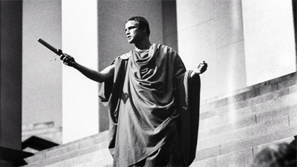 La presencia de Antonio, el más romano entre los romanos en el film, subraya su brillante sentido político. Dialoga, pero en realidad juega, con la plebe, variando el ritmo y con pausas plenas de disimulo para evaluar el efecto que produce su estrategia retórica. En concreto, dos primerísimos planos de su rostro nos dejan ver cómo está prestando oídos a la evaluación que la plebe hace de sus palabras, al tiempo que muestra su satisfacción por los efectos. Se detiene sigilosamente cada vez que pronuncia las palabras «ambición» u «hombres de honor», para que la plebe vaya asociando ideas. La mostración del cadáver va precedida de un primer plano del ciego adivino, que deja ver simultáneamente la acción de Antonio, y va seguida de un barrido por parte de la cámara de los rostros de los primeros espectadores del auditorio para mostrar su aflicción e ira in crescendo y, como contraste, su ceguera ante las verdaderas intenciones de Antonio.
