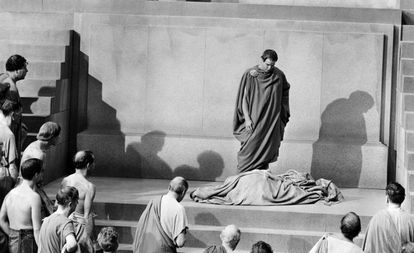 El film refleja de forma impresionante los espacios públicos de la antigua Roma, con una hermosa fotografía que recuerda los montajes escénicos del nazismo (Wyke 2004), y, aunque está lleno de matices, es deudor de las representaciones teatrales. Mankiewicz dividió la historia en dos partes: la trama que lleva a la muerte de César y sus consecuencias. Y estructuró el relato en torno a los personajes y a los sucesos que les afectan: la entrada triunfal de César y su dudoso éxito, la tormenta, los ruegos de Porcia y los de Calpurnia a sus respectivos esposos, Bruto y César, la muerte de éste, y la batalla de Filipos. Para nuestros propósitos, destacan el diálogo inicial entre Casio y Bruto, el soliloquio de éste y su discurso y el de Antonio ante la plebe.