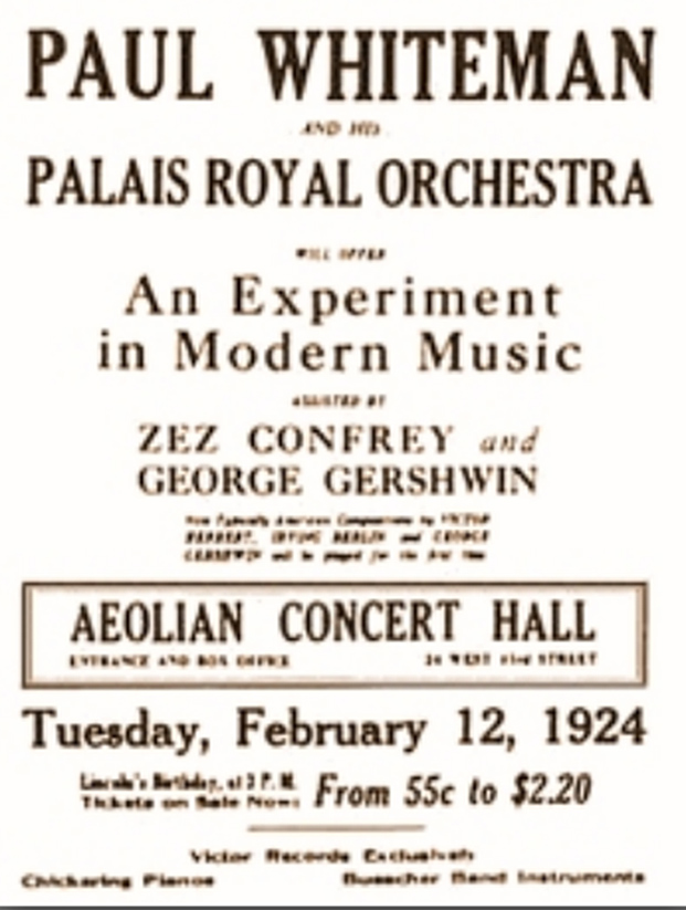 Para el estreno de “Rhapsody in Blue”, Paul Whiteman preparó a conciencia un concierto al que denominó “An Experiment in Modern Music”. En él sonaron versiones de temas populares, un popurrí de melodías rusas, canciones de Irving Berlin con un tratamiento “semi sinfónico”, y dos obras escritas exprofeso para la función “Suite of Serenades” de Victor Herbert y “Rhapsody in Blue” de George Gershwin.
