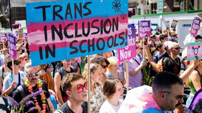 Pancarta a favor de los derechos de los menores transgénero mostrada en una marcha en Londres (Reino Unido), el pasado 9 de julio.GETTY IMAGES