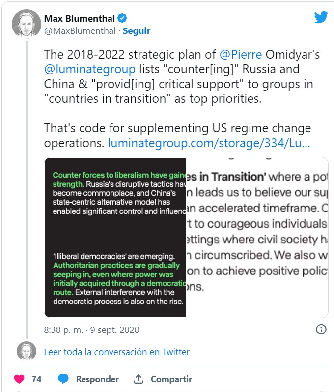Como el editor de Grayzone, Max Blumenthal, documentó en una investigación con Alex Rubinstein, Luminate es un componente integral de la red mundial de propaganda y cambio de régimen del oligarca estadounidense Pierre Omidyar, vinculado a la inteligencia.