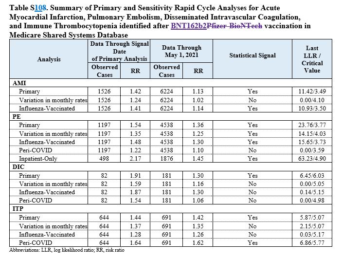 Cuatro resultados alcanzaron el umbral para una señal estadística después de la vacunación con BNT162b2, incluida la embolia pulmonar (EP; RR = 1,54), infarto agudo de miocardio (IAM; RR = 1,42), coagulación intravascular diseminada (DIC; RR = 1,91) y trombocitopenia inmune (ITP). ;RR = 1,44). Después de una evaluación adicional, solo el RR para PE aún cumplía con el umbral estadístico para una señal; sin embargo, los RR para AMI, DIC e ITP ya no lo hacían. No se identificaron señales estadísticas después de la vacunación con las vacunas mRNA-1273 o Ad26 COV2.S.Interpretación