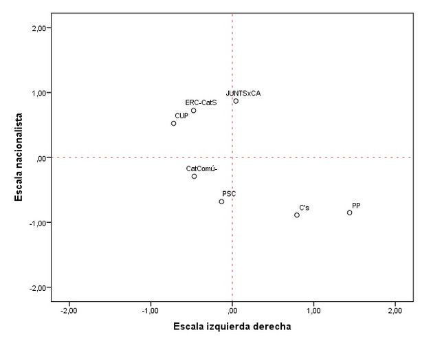Una conclusión visual es esta, el partido más votado el Cataluña tiene el electorado que más se inclina hacia el polo no nacionalista catalán, el segundo partido con más votos tiene a los electores más escorados hacia el polo nacionalista catalán. Al mismo tiempo, ambos partidos son relativamente moderados en el eje ideológico: el promedio de sus votantes se encuentran entre el centro y el centro-derecha.