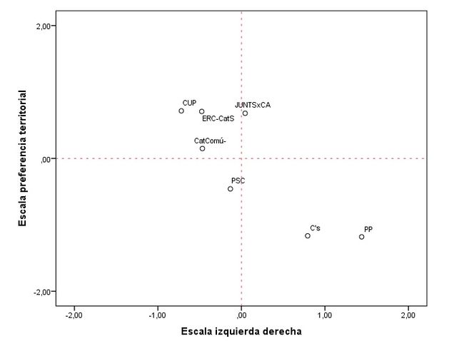 La comparación entre la escala de ideología nacionalista y la escala de preferencias territoriales (donde un polo es el estado unitario y el otro el derecho a la independencia) revela un contraste para los "Comunes": estos son menos nacionalistas que la media de Cataluña, pero están más a favor de mayor autogobierno que la media de Cataluña. Los partidos más nacionalistas tienen prácticamente las mismas preferencias territoriales y por eso es justo llamarlos independentistas como identificador principal.