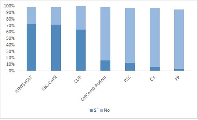 Por último este gráfico reitera la observación previa a propósito de la indentificación con la ideología nacionalista, pero usando una respuesta que invita a la disyuntiva en lugar de una escala gradual. Ciudadanos, como el PP, son partidos que claramente representan a votantes no-nacionalistas catalanes. El nacionalismo catalán está representado en el independentismo, con cierta ventaja para la lista de Puigdemont.