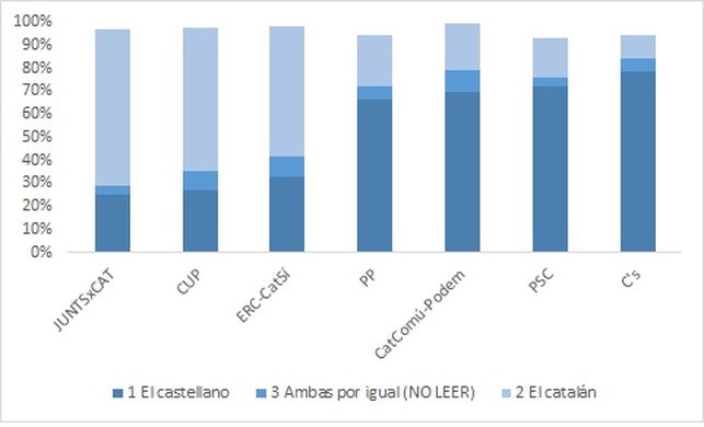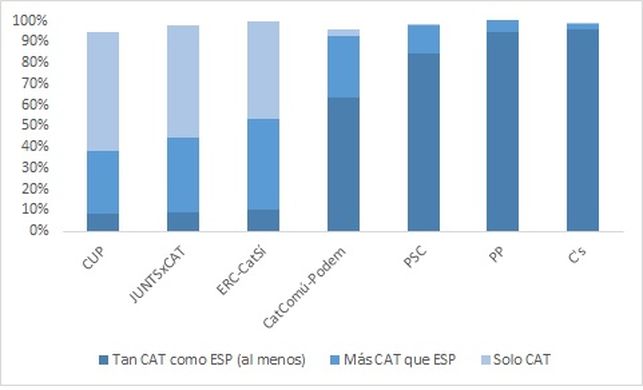 La identidad se segmenta claramente por partidos. Los partidos más alejados del nacionalismo catalán tienen un electorado muy homogéneo en cuanto a su identidad "hispano-catalana".