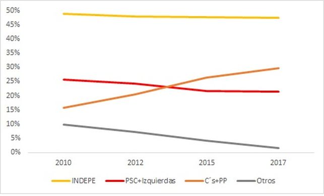 Gráfico 1. Evolución del voto, agrupado, en las últimas elecciones al Parlamento de Cataluña.