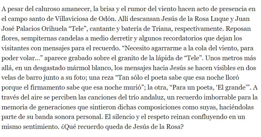 "…Al aire hay voces que apuntan que Jesús ya no nos canta. Hay corrillos que comentan que ya no existe TRIANA. Va por el Guadalquivir la pena, una penita que baja, que baja muda, ‘callá’, hasta perderse en Sanlúcar, sin cobijo... sin garganta… Garganta de plata y oro la suya que nos cantara sones de su Andalucía con candencias de oro y plata… Pero yo no estoy de acuerdo, que Jesús sí que nos canta…¿Es que no escucháis su voz “pegaíta” a la Giralda? y también por la calle Feria… Junto a la Macarena guapa y junto a la ‘plaza de toros’ de la Real Maestranza… Hoy TRIANA no se acaba. Aún hoy TRIANA es TRIANA si las estrellas del cielo y la luna no me engañan… Aún hoy la voz de Jesús nos canta desde la distancia…"