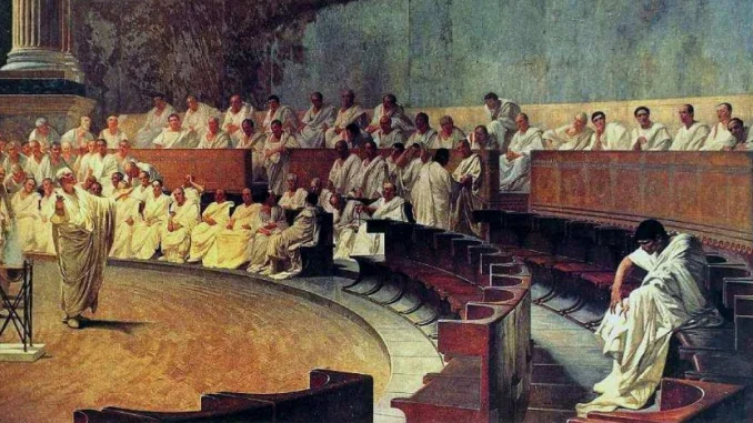 “Cicerón denuncia a Catilina”, del pintor italiano Cesare Maccari, 1880, Palazzo Madama, Roma.