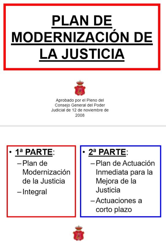 El Plan de Modernización de la Justicia fue aprobado por el Pleno del Consejo General del Poder Judicial, celebrado el 12 de noviembre de 2008. Dicho Plan, según la propia página del Consejo, se orienta al perfeccionamiento de la Administración de Justicia incidiendo en los factores ligados a la modernización e innovación, según la constante demanda de los operadores jurídicos.