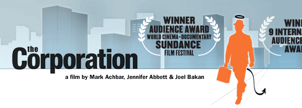 The Corporation' es un documental dirigido por Mark Achbar y Jennifer Abbott que durante dos horas y cincuenta y tres minutos se interna en el mundo empresarial psicopático. Está basado en el libro con el título 'La Corporación, la persecución patológica del beneficio y el poder', de Joel Bakan. Con entrevistas realizadas tanto a ejecutivos de multinacionales, brokers de bolsa, espías industriales, así como a activistas y pensadores contra la globalización (Noam Chomsky, Naomi Klein y Michael Moore, entre otros) se analiza el comportamiento de las multinacionales. Todo adornado con imágenes de anuncios y noticias de la televisión y videos promocionales de las empresas. La linea argumental consiste en dar por válida la hipótesis legal por la cual una empresa es "una persona" con derechos y obligaciones. Si es así la película se adentra en su comportamiento, su conducta y sus deseos. Amoral, única y exclusivamente motivada por la búsqueda del beneficio propio, no obstante busca la autojustificación y dar una cara humana. Sometiendole a un test psiquiátrico propuesto por la Organización Mundial de la Salud, Joel Bakan demuestra que "La Corporación" responde al perfil de un psicópata, y para testificarlo entrevistan a un alto cargo del FBI especializado en Psicópatas. La película, entre otros premios, ganó el de la audiencia al mejor documental en el festival de cine de Sundance, al que por premura no se presentó, pero fue invitada especialmente y aclamada por el público. A partir de este premio, el autor decidió distribuir libremente la serie por las redes de pares.
