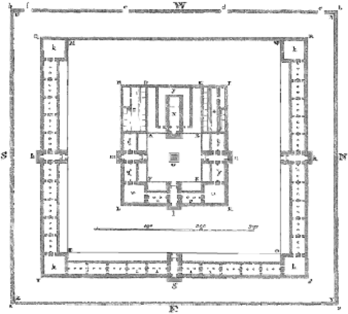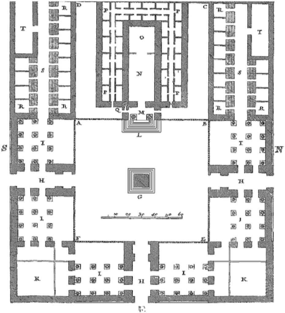 R.R.R.R, etc. Los edificios para las veinticuatro estancias de los Sacerdotes, sobre el pavimento, en cada lado del Lugar Separado, con tres plantas de alto, sin claustros, pero con las plantas superiores más estrechas que las de abajo, con el fin de dejar sitio para las galerías de delante de ellas. Había 24 Cámaras en cada planta y se abrían hacia una pasillo o corredor, S.S. entre los edificios.
