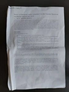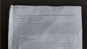 Tan pronto como su vuelo aterrizó en el aeropuerto de Luton, el piloto anunció que la policía fronteriza estaba “a la vuelta de la esquina” y pidió a todos los pasajeros que prepararan sus pasaportes. La policía esperaba a Klarenberg al pie de las escaleras que conducían a los pasajeros del avión a la pista. Inmediatamente lo llevaron a una habitación trasera y le informaron de su detención según el Anexo Tres, Sección Cuatro de la Ley de Fronteras y Contra el Terrorismo de 2019.