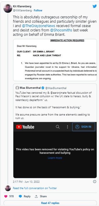 Emma Briant, una autoproclamada experta en desinformación que participó en la campaña de Mason para sabotear a los críticos de la OTAN, envió abogados para exigirle a Klarenberg que elimine todos sus artículos que la mencionan de Internet. Las cartas de los abogados también amenazaban con súper mandatos judiciales costosos para evitar más informes y cuestionaban la “autenticidad” del contenido de los correos electrónicos.