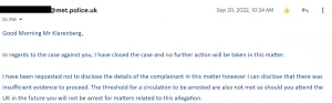 Sin embargo, se notificó a Klarenberg en septiembre de 2022 (ver más abajo) que la investigación policial se había cerrado.