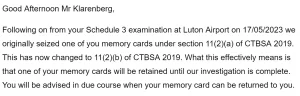Una semana después de liberar a Klarenberg de la detención, la policía le devolvió su tableta con cinta adhesiva sobre sus cámaras, junto con dos tarjetas de memoria. La policía se quedó con una tarjeta SD vieja, que en su mayoría contenía música, con el argumento de que podría ser “relevante para procesos penales”.