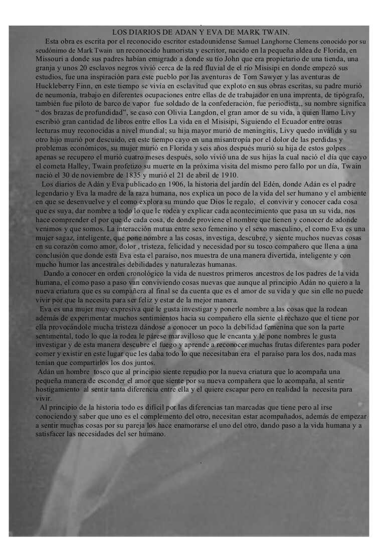 Lunes. La criatura nueva dice que su nombre es Eva. Me parece muy bien, no tengo objeciones. Dice que es para llamarla, cuando yo quiero que venga. Le dije que entonces era superfluo. Es evidente que la palabra hizo que me respetara más; y en realidad es una palabra grande, buena y que soportará la repetición. Me dijo que no es una criatura, es una Ella. Lo más probable es que esto sea dudoso; sin embargo para mí es lo mismo; lo que ella es no sería nada para mí si se metiera en sus asuntos y no hablara.