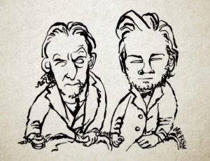 Julian Assange y Roger Hallam. Ilustración del Sr. Fish para Scheerpost.