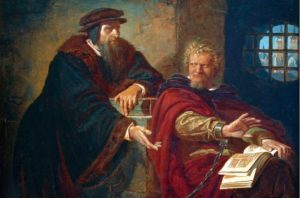 'Última conversación de Calvino con Servet' (en la cárcel), óleo de Pixis Theodor de inspiración calvinista, fechado en 1861, donde Calvino "intenta" convertir a Miguel Servet, humanista español, médico y teólogo del siglo XVI que murió en Ginebra quemado en la hoguera tras ser acusado de hereje por el Consejo de la ciudad, a instancias del reformador Juan Calvino. AKG Images