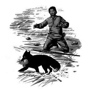 Los polluelos no hicieron más que aguzarle el apetito. Brincó y cojeó con torpeza, con el tobillo dislocado, arrojando piedras, y en ocasiones gritando, ronco; otras veces brincaba y cojeaba en silencio, levantándose, hosco y paciente, cuando caía, o frotándose los ojos con la mano cuando el vértigo amenazaba vencerlo.