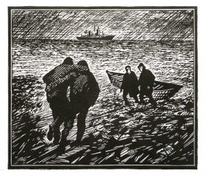 Bajaron por la costa, cojeando, doloridos, y en una ocasión el primero de los hombres trastabilló entre las rocas sembradas al azar. Estaban cansados y débiles, y sus rostros tenían la expresión tensa de la paciencia que viene con las fatigas mucho tiempo soportadas. Iban cargados con fardos envueltos en mantas y amarrados con correas a los hombros. Otra correa les pasaba por la frente, y ayudaba a sostener los bultos. Cada hombre llevaba un rifle. Caminaban en postura encorvada, los hombros bien hacia adelante, la cabeza más adelante aun, los ojos clavados en el suelo.