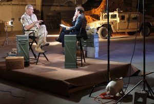 El general Tommy Franks, jefe de las fuerzas estadounidenses en Irak, habla con George Stephanopoulos de ABC durante una entrevista en el Coalition Media Center en Doha, Qatar, el 13 de abril de 2003. Steven Senne | punto de acceso