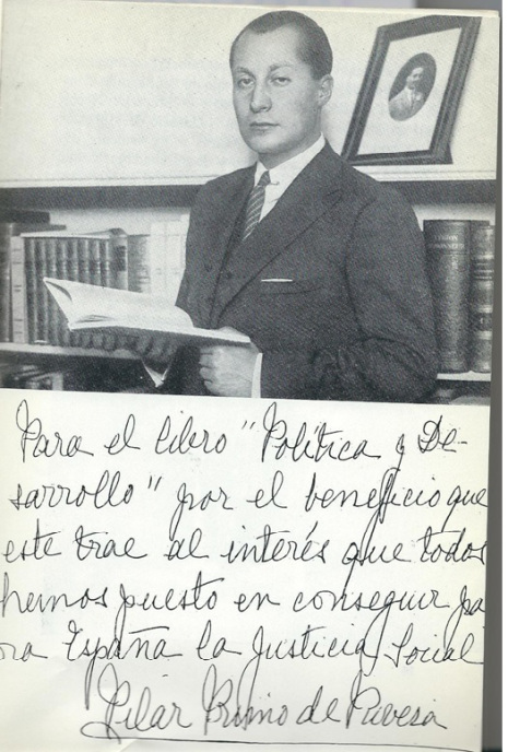 Del que ya resultaría sintomático que figurase en sus inicios una fotografía del “protomártir” -que insertamos a continuación, con una dedicatoria manuscrita de Pilar Primo de Rivera. Pero es que además, las referencias contenidas en dicho libro se hacían sólo y expresamente a un Estado Social de Derecho –no se mencionaba el calificativo monárquico-, de ahí que, se explicitase dicho concepto: ‘El Estado Liberal ha tenido que ceder paso al Estado Social de Derecho; es decir el Estado cuya acción persigue, dentro del mayor respeto al derecho, la consecución del bienestar social. De una actividad exclusivamente policial se ha pasado a una actividad de servicio público’.