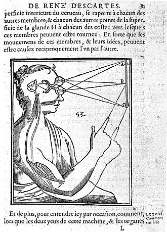 Diagrama del funcionamiento de la visión binocular y la glándula pineal en el Tratado del hombre.