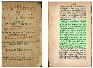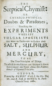 En su libro EL QUIMISTA ESCÉPTICO: O CHYMICO – Dudas y paradojas físicas que tocan los PRINCIPIOS DEL ESPAGIRISTA Comúnmente llamados HIPOSTÁTICOS, ya que deben ser propuestos y defendidos por la generalidad del ALQUIMISTA , Boyle se explaya en argumentos para rebatir las teorías de la existencia de principios o elementos aristotélicos o paracélsicos que se encuentran en todos los cuerpos mixtos. En la página 350 de este libro se menciona la definición de “ elemento ” o “ principio ” que daban los químicos de la época:
