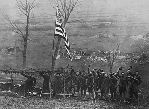 En la primavera de 1917, Estados Unidos se adentró en este pozo de muerte y engaño. En el ejército francés empezaban a producirse motines. Pronto hubo motines en 68 de las 112 divisiones y 629 hombres fueron juzgados y condenados, los pelotones de fusilamiento mataron a cincuenta personas. La presencia de tropas americanas era urgente.